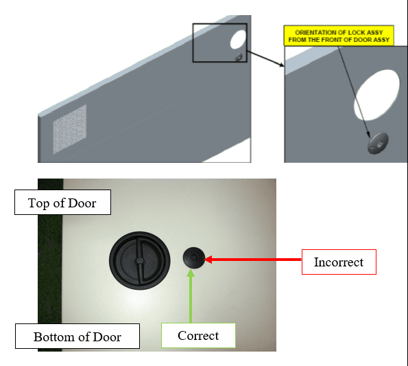 Return to the checklist selection list 710-409-00 Rev A, S48592-100R Please enable JavaScript in your browser to complete this form.Enter Serial Number *Enter Job Number *Customer (AUTO)Part Number (AUTO)Description (AUTO)Page 1 - Final Inspection Checklist Sample Criteria (Examples) 1. All edges are to be free from sharp and rough surfaces. *YesNoN/A2. Good powder paint coverage (No hanger marks, drips, or runs). Poor paint coverage not acceptable. *YesNoN/A3. No chipping, rust, or scratches. *YesNoN/A4. All welds must be ground clean and / or hidden. *YesNoN/A5. All PEM nuts are to be free of overspray, powder paint, and burrs. Paint on threads is not acceptable. *YesNoN/A6. Verify that male and female hinges are compatible. *YesNoN/A7. All metal parts shall be poly-bagged to prevent paint chipping and damage. *YesNoN/A8. Check all colors with provided samples. *YesNoN/A9. Verify shipping container shows no signs of leakage, such as holes or wet spots. *YesNoN/APage 2 - Final Check Criteria Examples found on Page 1 / Use arrows when applicable. 1. Confirm height, width, and depth is as referenced at 58.813 REF, 21.313” REF, .875 REF respectively. Height *Width *Depth *2. Confirm Door Handles, Latching Mechanism and Hinges function without obstruction. *YesNoN/A3. Confirm paint all surfaces, except where indicated( Flag#6) , are texture light gray.***No overspray is permissible*** Must compare against archived color sample. *PassFail4. Confirm masked edge of circle all around .07”. Flag #5 *YesNoN/A5. Confirm Ground stud location. Flag #7 ; Add pc part marking after finishing, on the surface indicated Flag#4 *YesNoN/A6. Confirm the far side of the unit at the location indicated is marked per Teradyne Inc. Control Document #CD0002 Method #6 (Black Ink 1/8”-1/4” height in san serif gothic font – “Teradyne Part Number”, ”Revision Letter” “Vendor Code”, ”Date Fabricated”. Date Fabricated to be XXYY where xx=week and yy=year.) Example: 987-684-00A 100330 2911 *YesNoN/APage 3 - Final Check Criteria Examples found on Page 1 / Use arrows when applicable. 1. Confirm the presence of Loctite 242 on hardware at Cam Latch location (2 Places). *YesNoN/APage 4 - Final Check Criteria Examples found on Page 1 / Use arrows when applicable. 1. Confirm there are 9 snap in nylon buttons at the location indicated. *YesNoN/APage 5 - Final Check Criteria Examples found on Page 1 / Use arrows when applicable. 1. Confirm the presence of Loctite 242 on the Southco Lock Assembly. *YesNoN/A2. Confirm the stack up of the lock assembly is as follows: Lock Assembly, Washer, and Hex Screw. *YesNoN/A3. Confirm the Lock Assembly is Torqued to 38-45 in-lbs using a Torque Wrench. *YesNoN/APage 6 - Final Check Criteria Examples found on Page 1 / Use arrows when applicable. 1. Confirm the orientation of the Lock Assembly when viewed from the front of the door is as indicated with the small dimple on the front facing downward. *YesNoN/APage 7 - Final Check Criteria Examples found on Page 1 / Use arrows when applicable. 1. Confirm the Locking Bar is situated between the door Brackets as shown and that the Open section of the Locking Bar is not deformed and is situated at the bottom of the door nearest the perforated section. *YesNoN/APage 8 - Final Check Criteria Examples found on Page 1 / Use arrows when applicable. 1. Confirm the orientation of the handle in the “home” position is parallel to the left / right side of the door and measures 4.20” +/-.050” from the outside of the door to the top of the handle and the outside of the door to the bottom of the handle as shown. *YesNoN/ATop Measurement *Bottom Measurement *Page 9 - Final Check Criteria Examples found on Page 1 / Use arrows when applicable. 1. Confirm door latches contain the appropriate hardware. *YesNoN/A2. Confirm door hardware is not compressed or deformed. *YesNoN/A3. Confirm the texture from the handle plate and handle are of the same finish. *YesNoN/A4. Confirm there are no defects in the handle as defined in Teradyne QAA-065-001. Inspector must print and review during inspection. *YesNoN/APage 10 - Final Check Criteria Examples found on Page 1 / Use arrows when applicable. 1. Confirm the CAM hardware is torqued to 75-80 in-lbs using a Torque Wrench. *YesNoN/A2. Confirm the presence of Loctite 242 on the threads of the CAM assembly. *YesNoN/A3. Confirm the stack-up of hardware is as follows: Lock Washer, Hex Nut. *YesNoN/APage 11 - Final Check Criteria Examples found on Page 1 / Use arrows when applicable. 1. Visual Inspection – Confirm metal finish color is yellow plating. No corrosion or scratches through coating are allowed. *YesNoN/A2. Functional Test – Confirm doors close tight creating a seal between door and the frame. *YesNoN/A3. Functional Test – Confirm doors latch in the closed position and are able to turn to the closed position. *YesNoN/A4. Functional Test – Confirm the locking bar stays in current position and is not “free falling”. *YesNoN/A5. Functional Test – Confirm door latches move freely without difficulty. *YesNoN/APage 12 - Final Check Criteria Examples found on Page 1 / Use arrows when applicable. 1. Confirm the function of the Lock Cam. There should be no obstruction or interference.. *YesNoN/APage 13 - Final Check Criteria Examples found on Page 1 / Use arrows when applicable. 1. Confirm the hardware for each screw on the hinge is tightened to 17-20 inch-lbs. 8 locations. *YesNoN/A2. Confirm the presence of 8 plastic washers between the door and the door hinge. *YesNoN/A3. Verify the hinge position is as indicated after hinges are tightened. *YesNoN/A4. Verify that male and female hinges are compatible. *YesNoN/APage 14 - Final Check Criteria Examples found on Page 1 / Use arrows when applicable. 1. Confirm the door is marked per Teradyne drawing specifications. (Part Number – Rev Letter – Supplier Code – Date Code) (Example: 977-233-00 E 100300 0213) Date Code is Week/Year. *YesN
